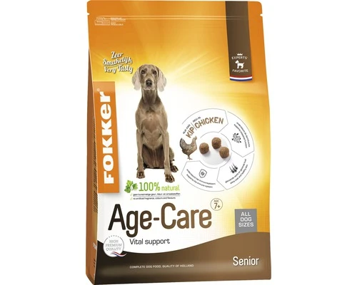 | Voederaanwijzingen | Voedingsadvies Voor de dagelijkse hoeveelheid Fokker Age-Care: raadpleeg de voedingstabel. De te geven hoeveelheden zijn richtlijnen, die mede afhankelijk zijn van lichaamsconditie, omgeving en inspanning van uw hond. Zorg ervoor dat er steeds voldoende vers drinkwater beschikbaar is. Houdbaarheidsdatum, partijcodering en registratienummer; zie verpakking.nnKoel, droog en indien mogelijk donker bewaren. |