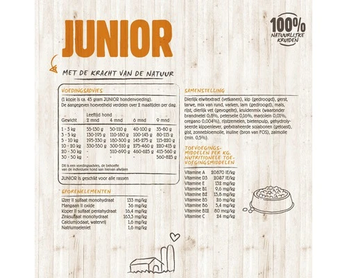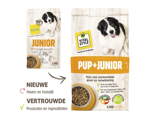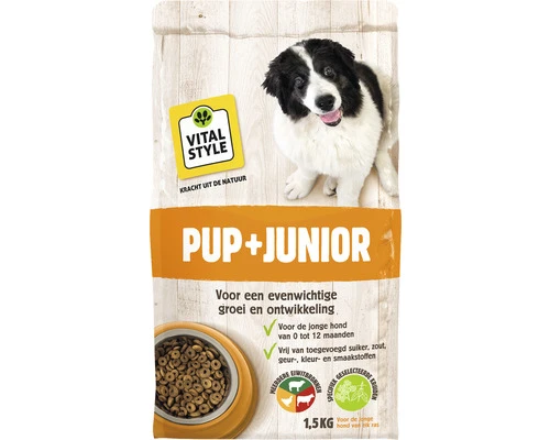 In Junior zitten onder meer de volgende 4 kruiden: brandnetel (voor sterke spieren, botten en pezen), peterselie (ondersteunt de nieren), marjolein (stimuleert de spijsvertering) en oregano (heeft een antioxidant werking).Wanneer stap je over naar ADULT?Kleine rassen kunnen na 6 maanden overstappen op ADULT, grote(re) rassen na ongeveer 9 maanden.100 % Natuurlijk, vrij van kleur-, smaak- en conserveringsmiddelenDe 100% natuurlijke voeding bevat geen geur-, kleur-, smaakstoffen of conserveringsmiddelen. Ook zijn er geen suikers of zouten toegevoegd. Met name de kruiden en vitamine E zorgen voor een prima houdbaarheid. En natuurlijk is VITALSTYLE diervoeding dierproefvrij.VITALSTYLE hondenvoedingVITALSTYLE diervoeding ondersteunt en versterkt de natuurlijke processen van je hond. Voor VITALSTYLE een basisprincipe. Waar je verder van uit kunt gaan: